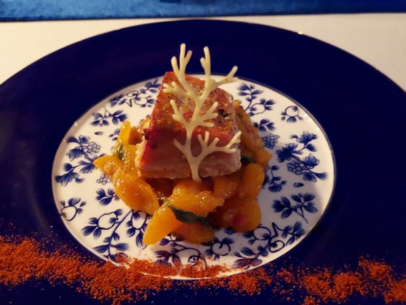 Novi meni potpisuje mladi šef Uroš Vujošević koji je u hotel došao iz poznatog senjačkog restorana Grafičar i koji je na večeri predstavio pet novih jela kroz pet sledova uparenih sa odabranim vinima. Prvi sled bio je tartar od dimljenog lososa sa kandiranim ananasom uparen uz vino kuće Torleanzi, a zatim i zanimljiv brusket sa bukovačom koji se lepo slagao sa etiketom 33 župske vinske kuće Braća Rajković.