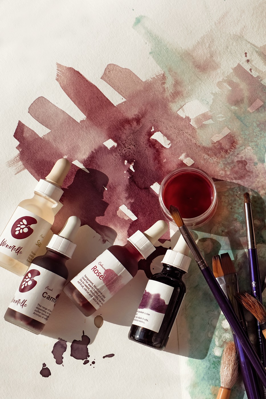 Saperavi iz Gruzije: neverovatno dubok, gotovo boje mastila. Četkice perem belim vinom, a radovi se s vremenom patiniraju, što je još jedan razlog zašto ih digitalizujem i koristim u dizajnu kako bi njihova originalna boja ostala zabeležena zauvek – objašnjava Sanja.