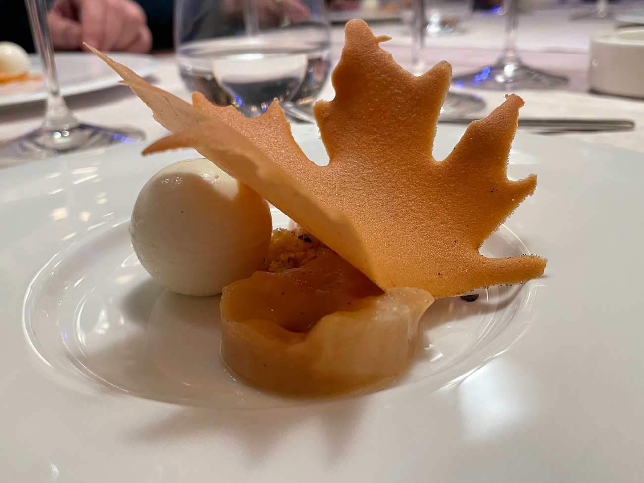 Smuđ muselin - zahtevna i duga priprema apsolutno se isplatilaI taman kada pomislite, to je to – na sto prvo stiže domaći kitnikez sa čokoladom, pa onda i najnoviji desert – mus od anisa i lajma, uz kranč od parmezana, sorbe od kruške i na sve to „zakačen“ slatki list, da asocira na jesen.