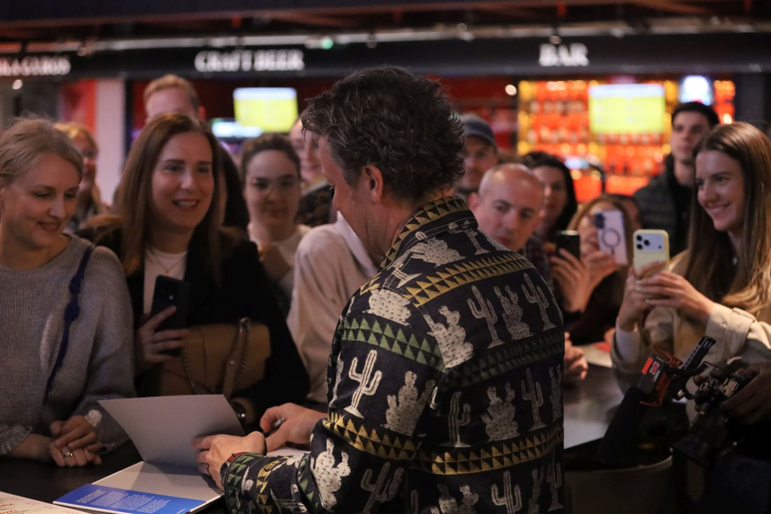 Jamie's Pasta Bar. Dobro raspoloženi šef fotografisao se sa zaposlenima u baru koji radi pod njegovim imenom i davao autograme fanovima, potvrđujući reputaciju komunikativnog i harizmatičnog selebriti šefa. Okupljene je pozdravio frazom "Hello, lovely people" koju koristi u većini svojih nastupa, i pohvalio se specijalitetima ovog pasta bara koje je lično izneo iz kuhinje.